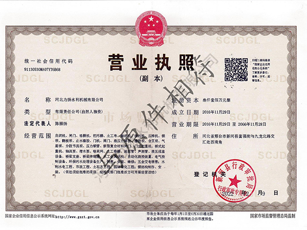 河北力揚水利機械有限公司,成立于2016年,地址河北省邢臺市新河縣富強街與九龍北路交匯處西南角具備生產(chǎn)及供應(yīng)、安裝能力。我們公司位于董振堂將軍故里,河北省邢臺市新河縣九龍工業(yè)區(qū),是一家集設(shè)計、生產(chǎn)、銷售、安裝、售后一體的綜合性水利機械廠家,現(xiàn)有人員共40余名,獲有國家頒發(fā)的全國工業(yè)產(chǎn)品生產(chǎn)許可證、ISO質(zhì)量管理體系認證、環(huán)境體系認證、職業(yè)健康體系認證并且我公司通過水利相關(guān)部門水工金屬結(jié)構(gòu)質(zhì)量檢驗中心的考核和監(jiān)督下獲得了:認證頒發(fā)的四項產(chǎn)品認證證書(平面閘門、弧形閘門、回轉(zhuǎn)式清污機、耙斗式清污